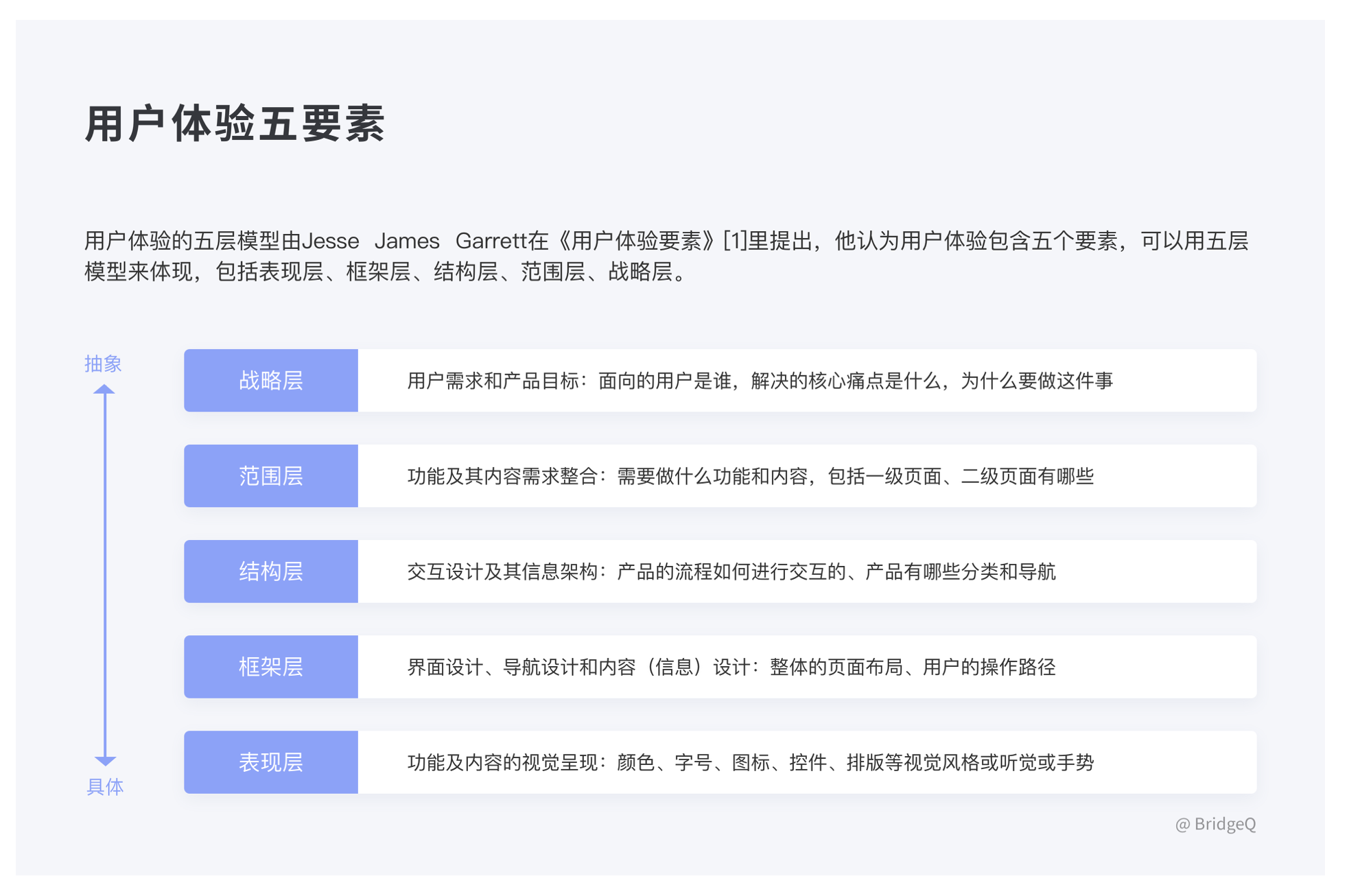 :用戶體驗(yàn)五要素(戰(zhàn)略層、范圍層、結(jié)構(gòu)層、框架層、表現(xiàn)層)。