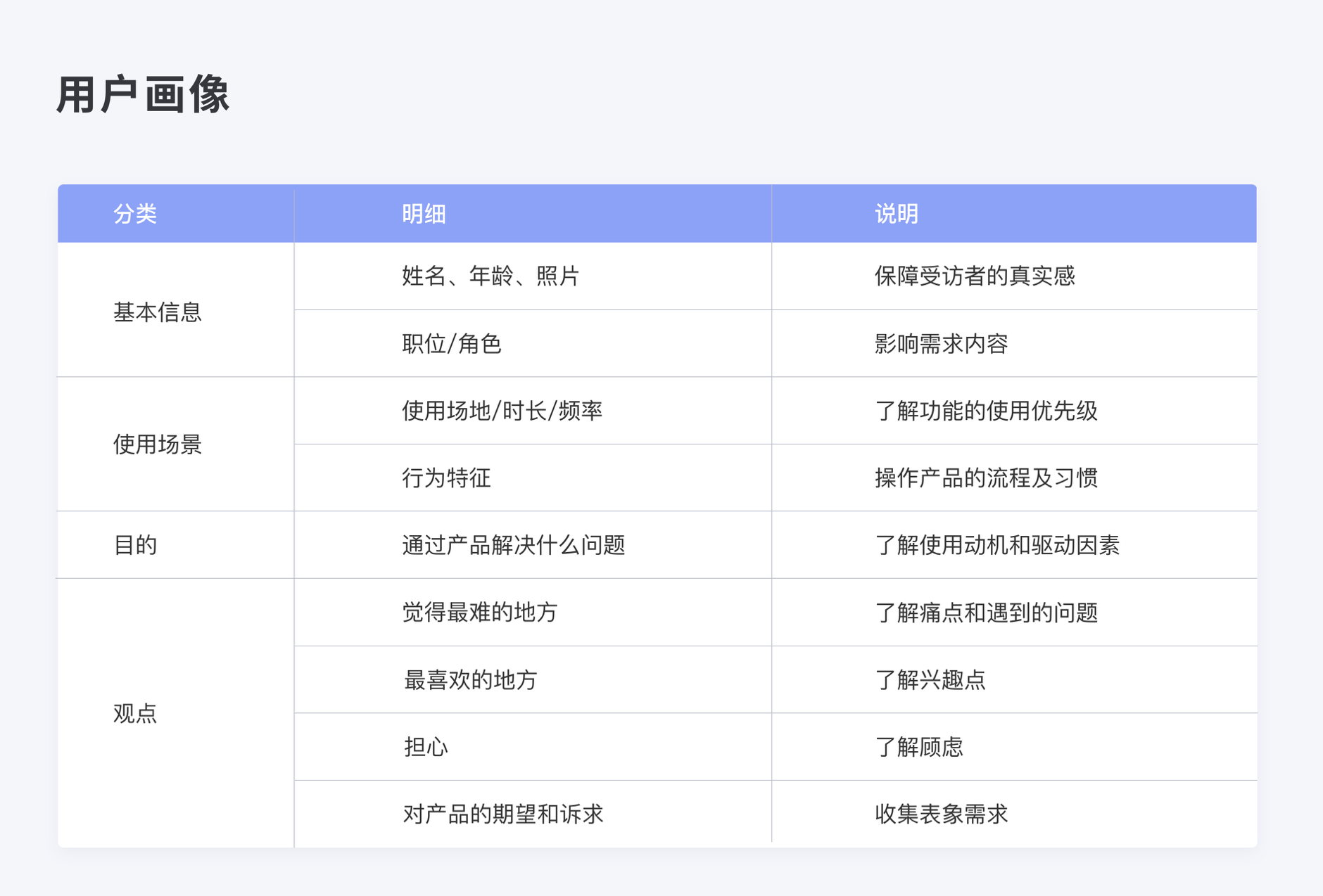 :基本信息、使用場(chǎng)景、痛點(diǎn)、期望;