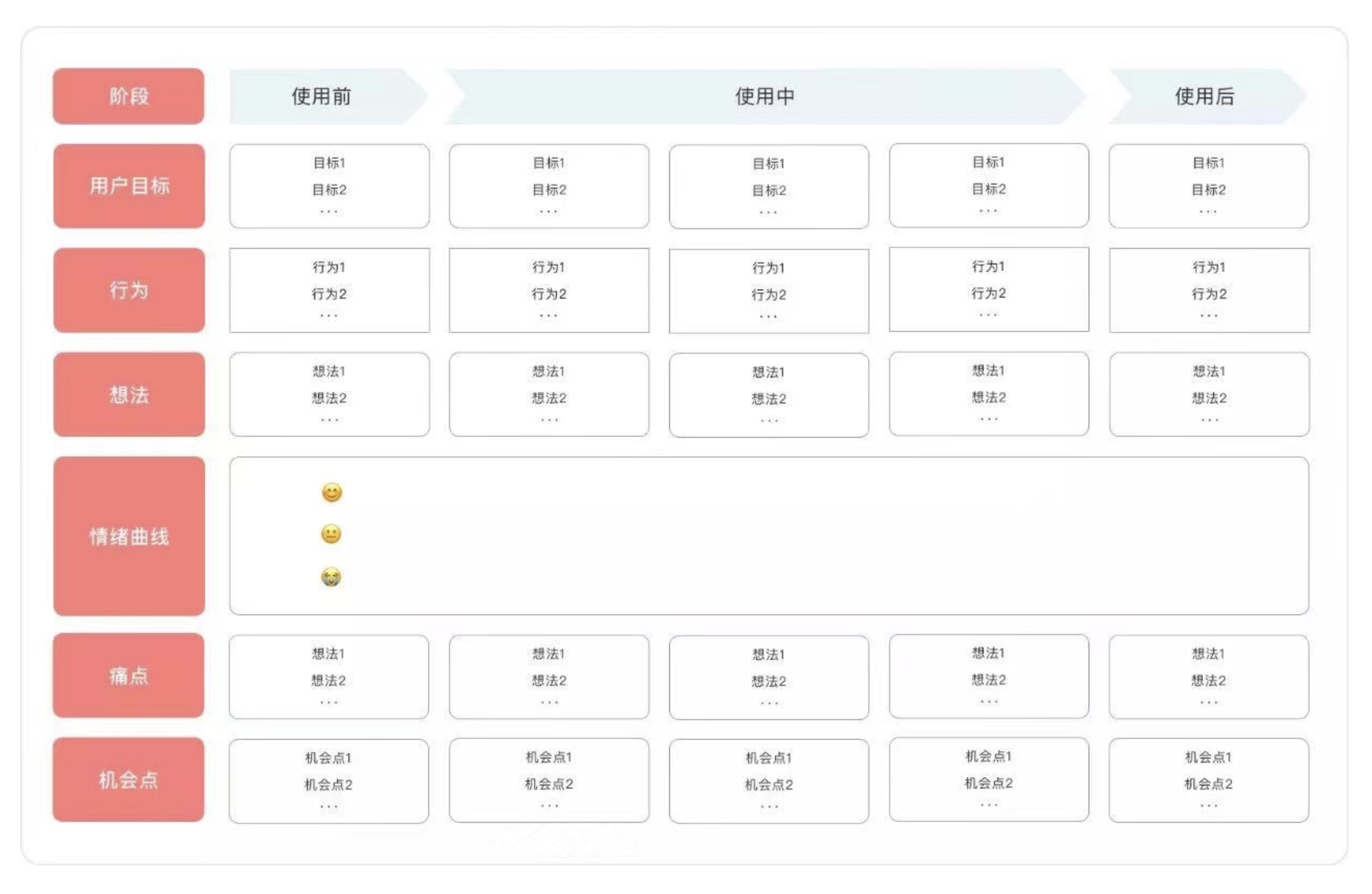 :可視化用戶全流程行為與情緒,還原 “使用前 - 中 - 后” 階段的目標(biāo)、觸點(diǎn)與痛點(diǎn)。