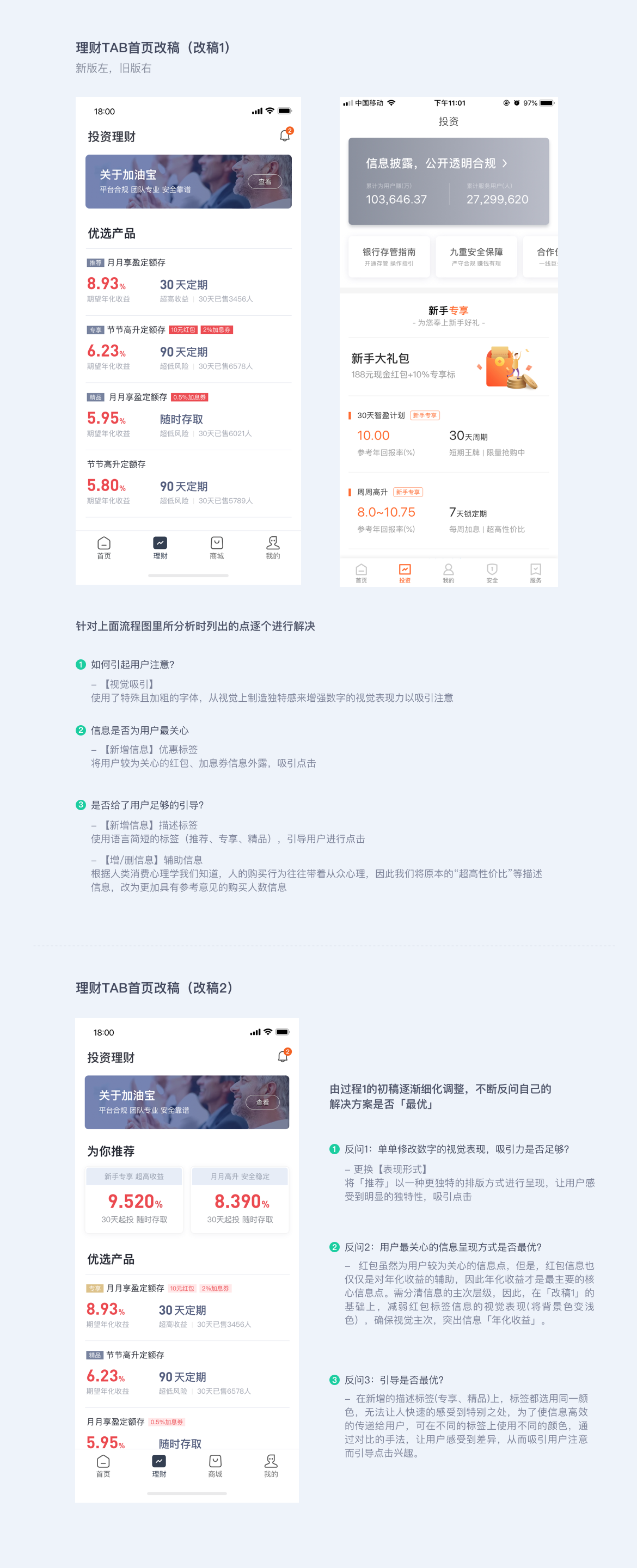 - 提升 item 點擊率:用加粗字體突出「年化收益」數字(如 9.520%),外露加息券、新手紅包等用戶關心信息,添加「推薦」「專享」等標簽引導點擊。