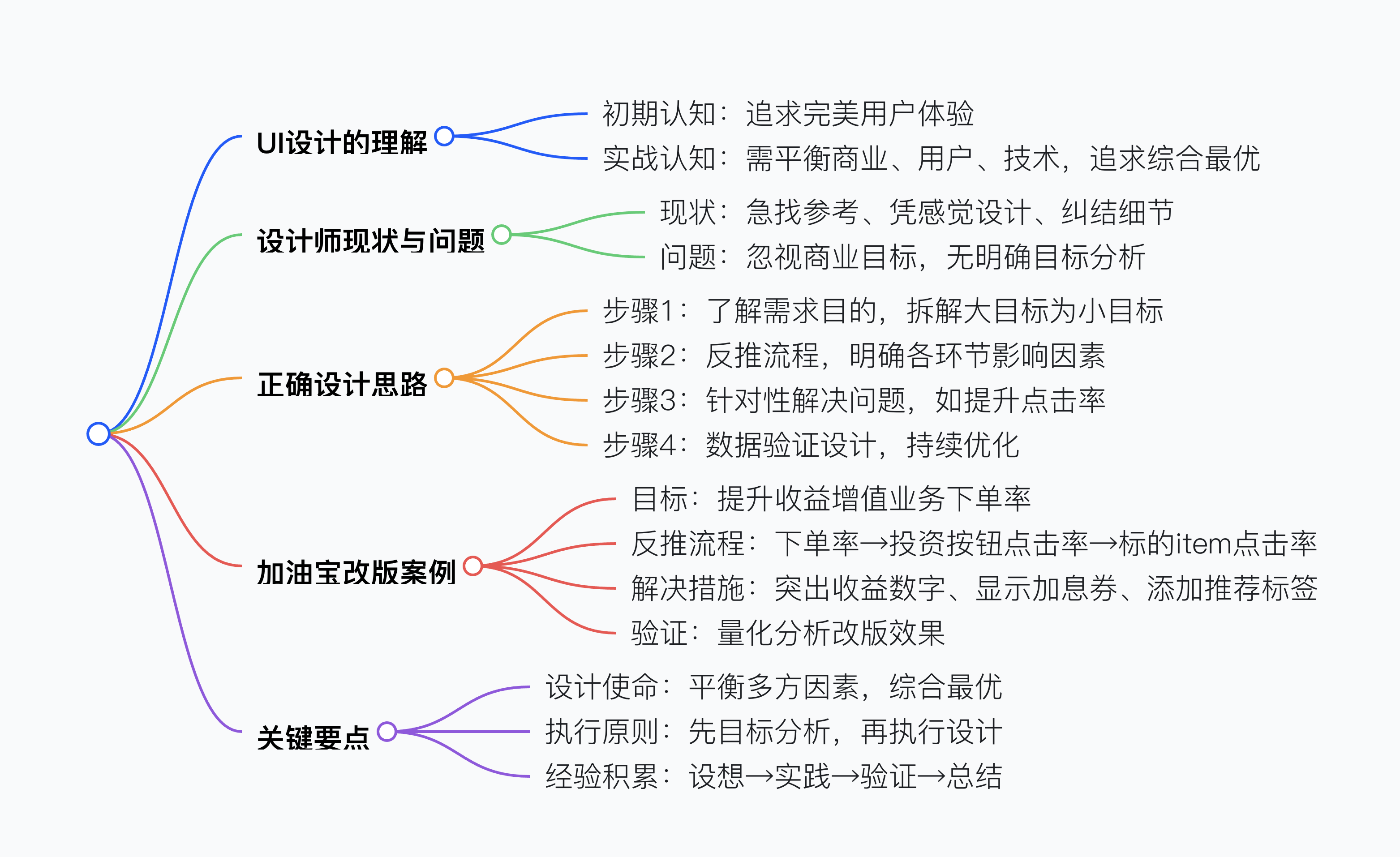 UI 設計的終極目標并非單純追求極致用戶體驗,而是在「商業(yè)」「用戶」「技術」等多方面條件限制下取得平衡,得出「綜合最優(yōu)」的解決方案。設計師常陷入拿到需求就找參考、憑感覺設計、在細節(jié)糾結的誤區(qū),正確做法是先明確需求背后的商業(yè)目標,將大目標拆解為小目標,如加油寶 APP6.0 改版時為提升 “收益增值業(yè)務下單率”,反推需提升標的 item 點擊率、“立即投資” 按鈕點擊率等,再針對性解決,最后通過數據驗證設計效果,如此才能積累經驗、理清思路。