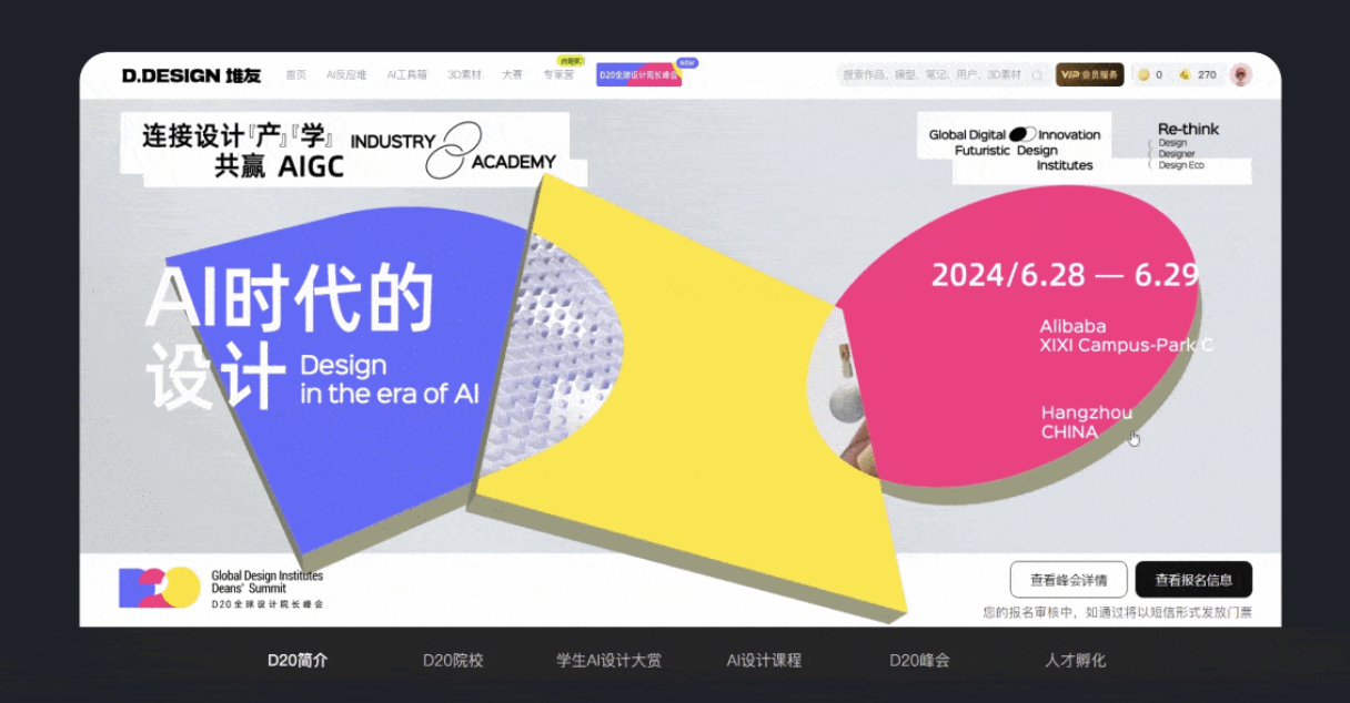 如果 B 端產(chǎn)品缺少體驗(yàn)設(shè)計(jì)環(huán)節(jié),其落地呈現(xiàn)的往往只是研發(fā)邏輯,而非用戶需求和心智,無法提供合理的人機(jī)交互。體驗(yàn)設(shè)計(jì)能打開用戶需求和心智的世界,讓用戶感受到產(chǎn)品是為自己量身定制的。由 Alibaba Design 發(fā)起的 D20 全球設(shè)計(jì)院長峰會官網(wǎng)首頁設(shè)計(jì)就很符合用戶心智,畫面簡潔時(shí)尚又不失動感,十分耐看。而且人性深處更容易被動態(tài)的事物吸引,下方的導(dǎo)航欄設(shè)計(jì)也很貼心,在電腦屏幕中完整展示,用戶想查看哪個(gè)部分,直接點(diǎn)擊對應(yīng)的導(dǎo)航欄就能精準(zhǔn)跳轉(zhuǎn),無需長時(shí)間拖拽。