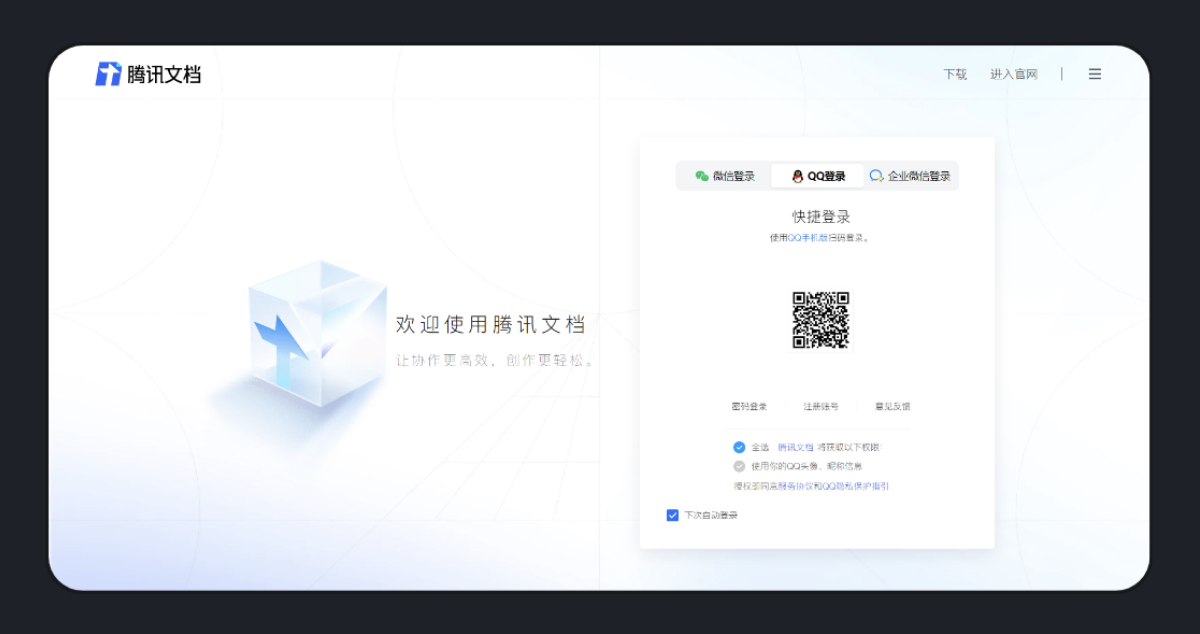 在符合業(yè)務(wù)邏輯的基礎(chǔ)上,體驗(yàn)設(shè)計(jì)能優(yōu)化 B 端產(chǎn)品復(fù)雜的流程,將復(fù)雜的迷宮簡化成一條直線,讓用戶操作界面時(shí)感到暢通舒適。騰訊文檔的登錄頁沒有讓用戶輸入一連串的賬號和密碼,而是采用二維碼方式,用戶掃碼即可登錄,快捷又方便,大大簡化了登錄流程。