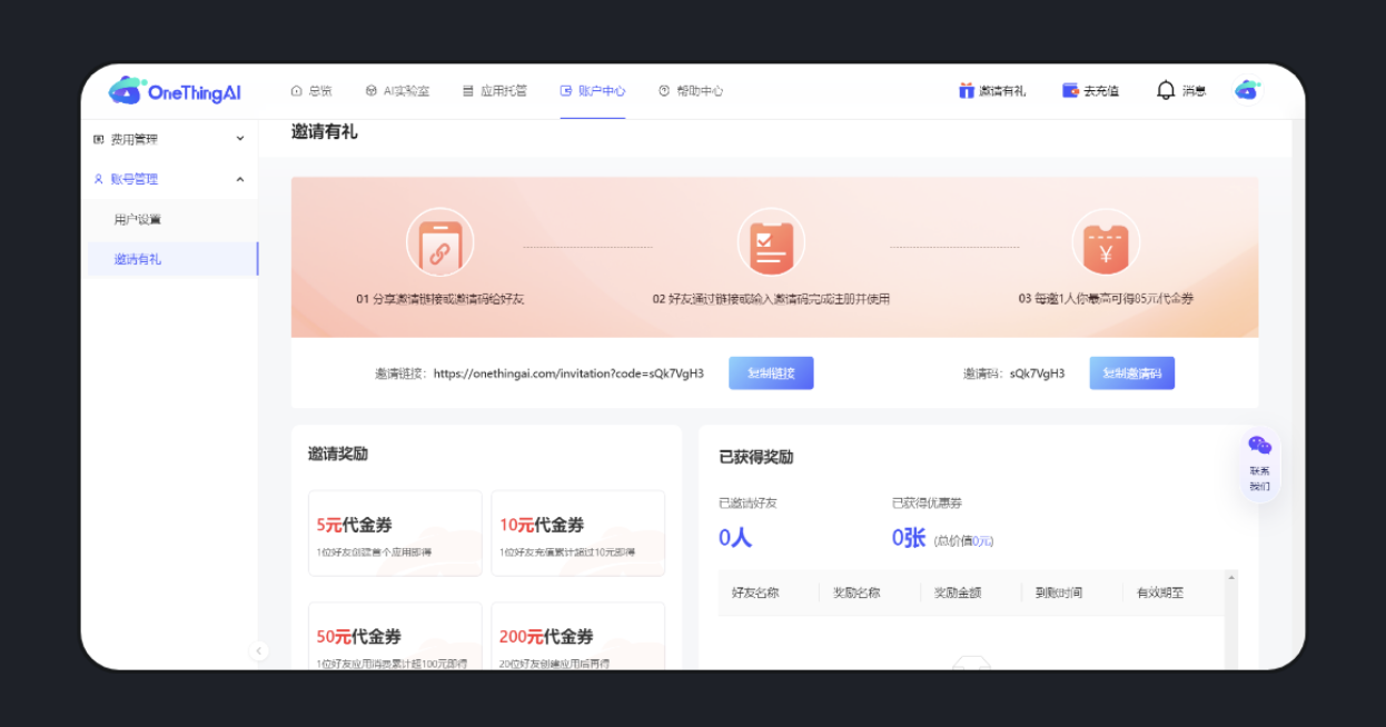 對于 SaaS 產(chǎn)品,在滿足業(yè)務(wù)場景的前提下,良好的體驗(yàn)如同口碑的種子,會不斷生根發(fā)芽,讓更多人愿意付費(fèi)并推薦給朋友,使產(chǎn)品像茁壯成長的樹一樣不斷吸引新養(yǎng)分。oneThingAI 推出的 “邀請有禮” 活動,會員推薦他人可獲得相應(yīng)代金券,再加上工具本身體驗(yàn)好、便捷易上手,在優(yōu)惠活動期間,吸引了眾多 AI 愛好者注冊購買,有效促進(jìn)了產(chǎn)品銷量增長。