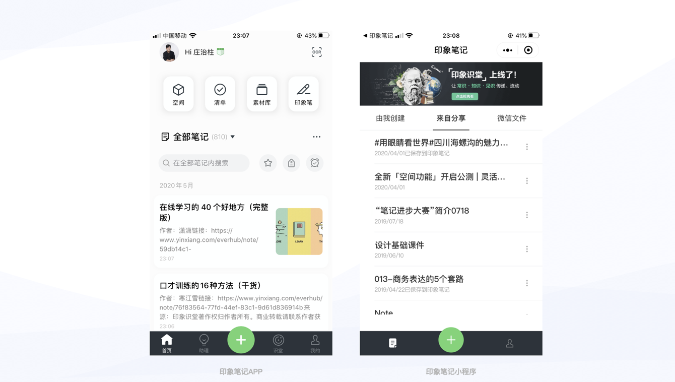 • 筆記類(如印象筆記):突出 “由我創(chuàng)建”“來自分享”“微信文件” 三個核心入口,方便用戶通過微信快速收集分享筆記,還支持一鍵導(dǎo)入微信文件,避免文件過期;