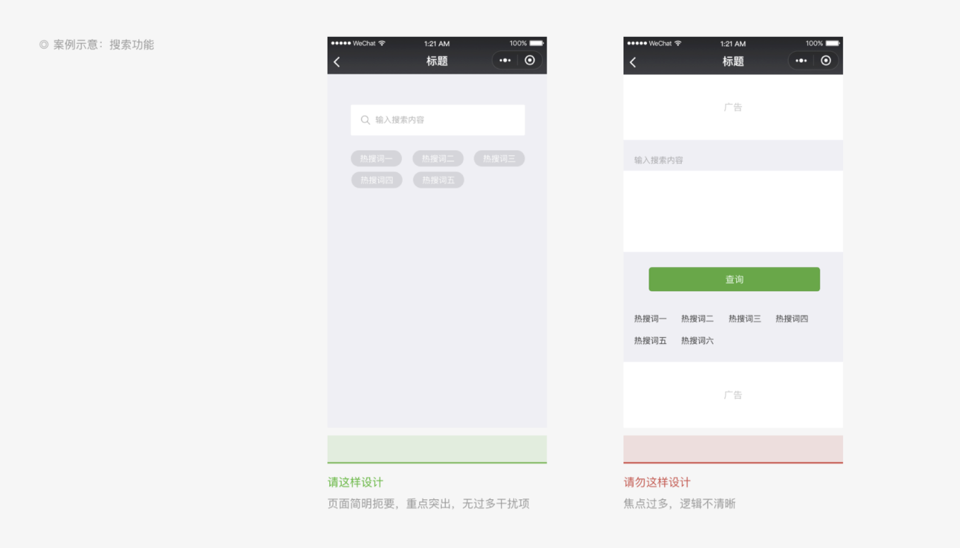 • 重點(diǎn)突出:頁面需簡明,聚焦核心內(nèi)容,避免多焦點(diǎn)干擾。例如搜索功能應(yīng)減少無關(guān)熱搜詞,多按鈕設(shè)計需明確主次(如主操作按鈕突出,輔助操作弱化);