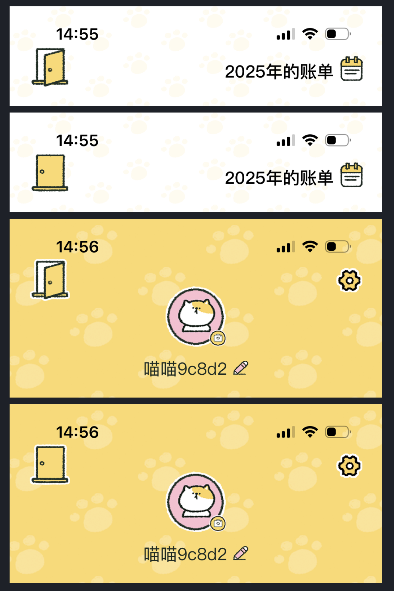 常規(guī)返回功能總離不開 “箭頭” 或 “返回” 文字,用戶雖能理解,卻少了點情感共鳴。而喵喵記賬 APP的做法,是把 “層級切換” 轉化為用戶熟悉的生活場景 —— 用 “門” 作為核心元素。