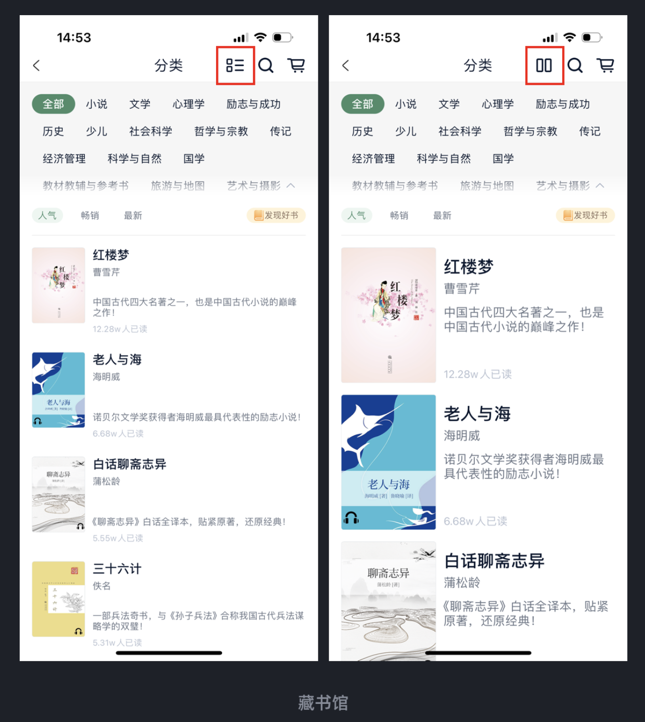 不是所有用戶都喜歡同一種瀏覽方式 —— 有人想快速掃過更多內容,有人則希望看清封面和細節(jié)。藏書館 APP在 “書庫分類” 模塊里,就做了 “可切換大小” 的布局設計:
