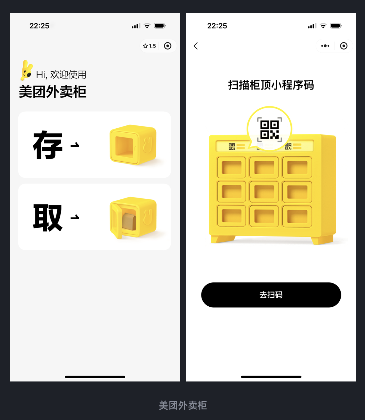 現(xiàn)在很多產(chǎn)品總想著 “多放功能才顯價值”,結果界面雜亂,用戶找不到核心操作。但美團外賣柜小程序卻反其道而行之 —— 打開界面后,只有 “存” 和 “取” 兩個核心按鈕,搭配 “掃描柜頂小程序碼” 的簡單指引,沒有任何廣告、推薦等多余元素。