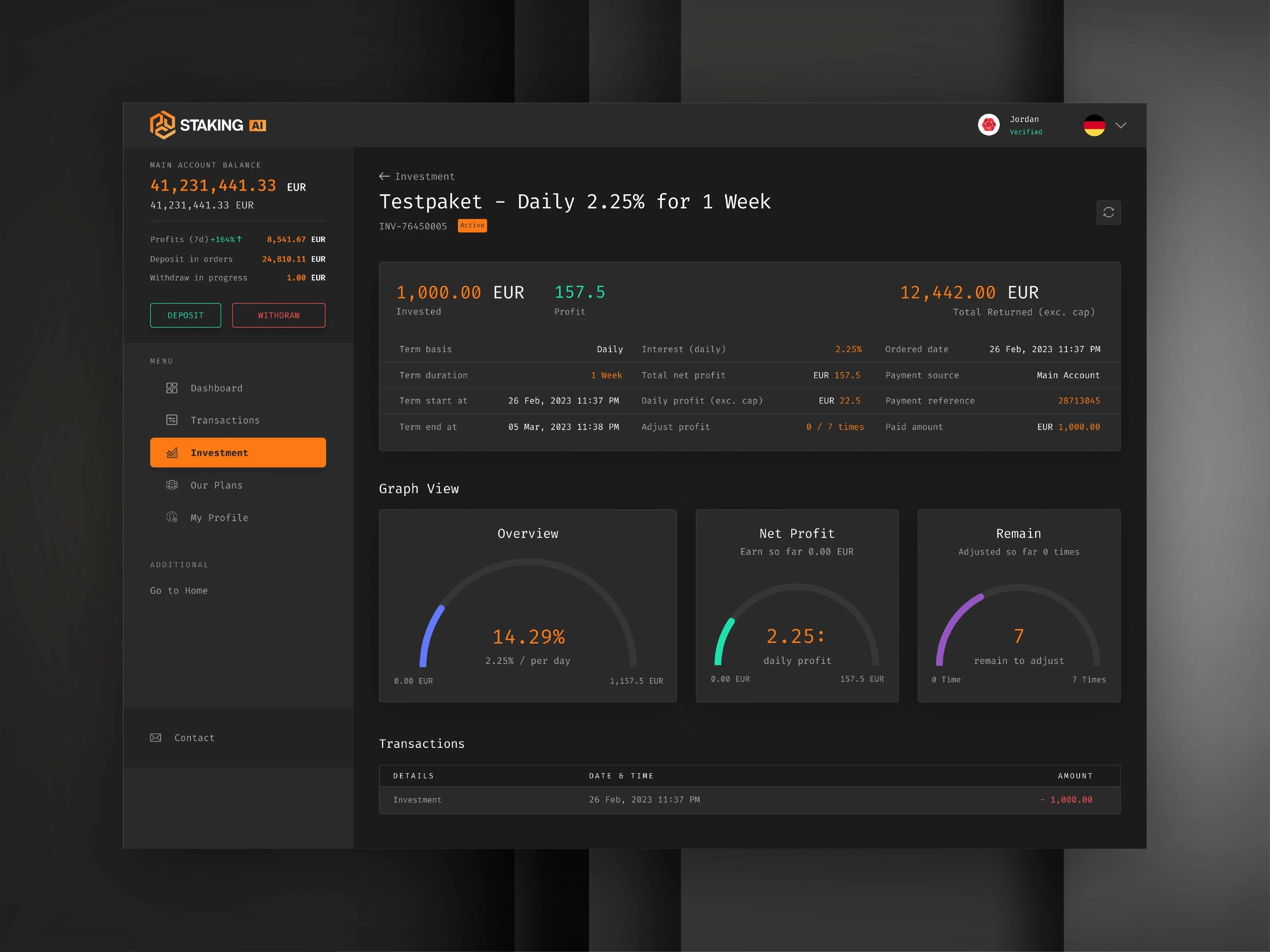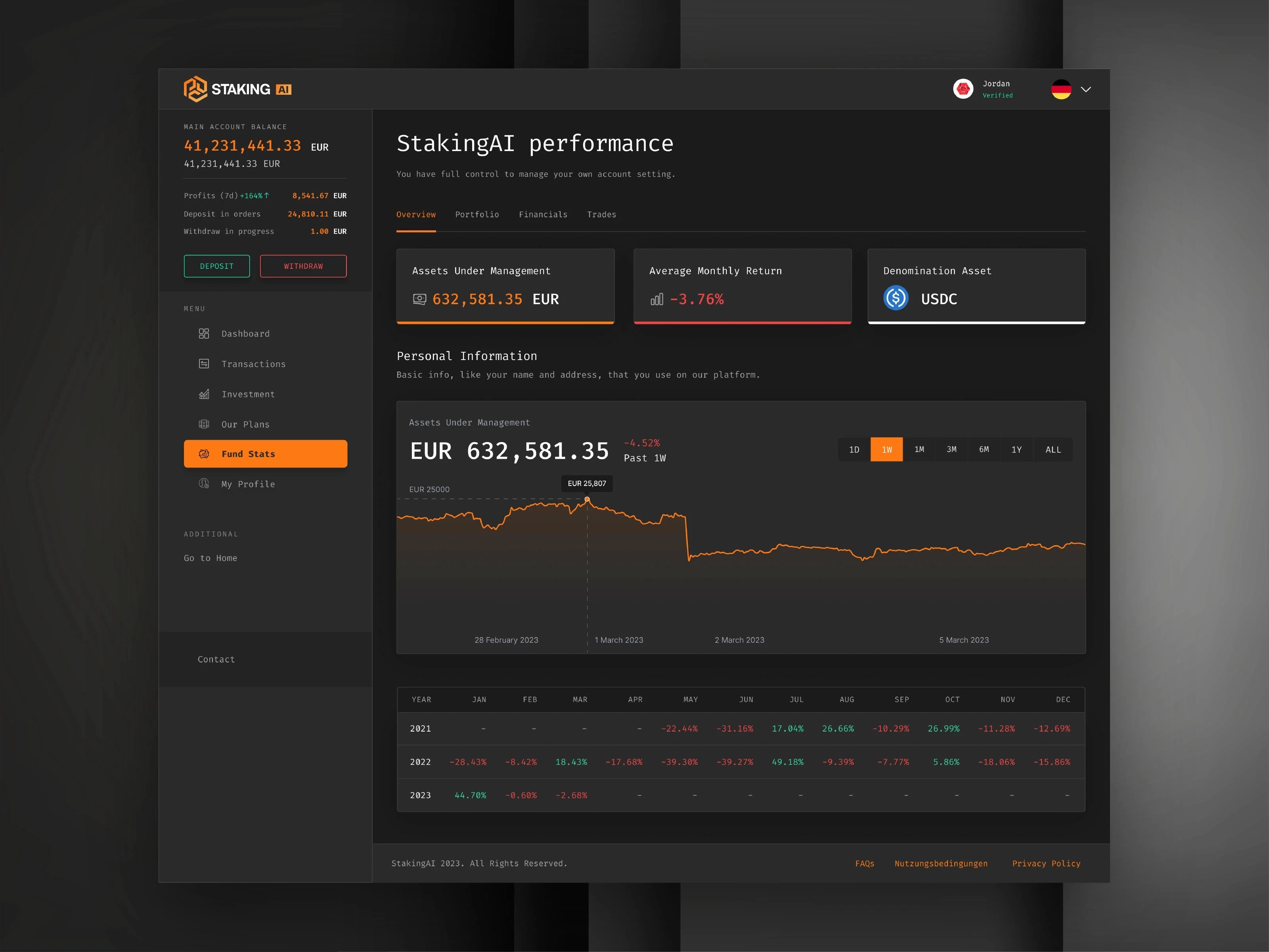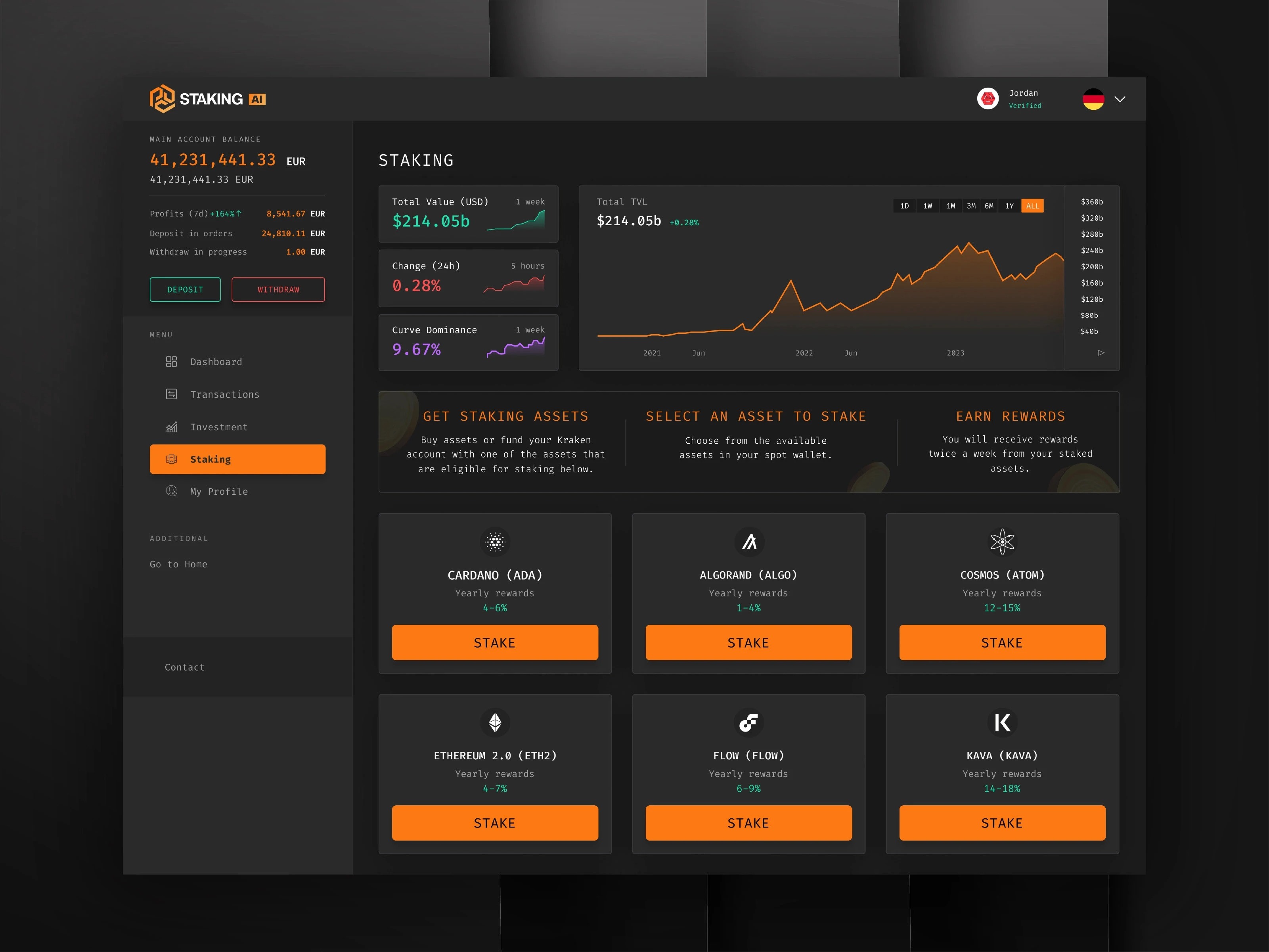 行業(yè)適配性:這種設計高度契合加密貨幣、金融投資類平臺的屬性,既通過深色風格傳遞 “穩(wěn)重、可信” 的品牌形象,又以精準的數據可視化和清晰的操作路徑,滿足投資者對 “資產透明化、操作便捷化” 的核心需求,是金融科技領域界面設計的優(yōu)質范例。