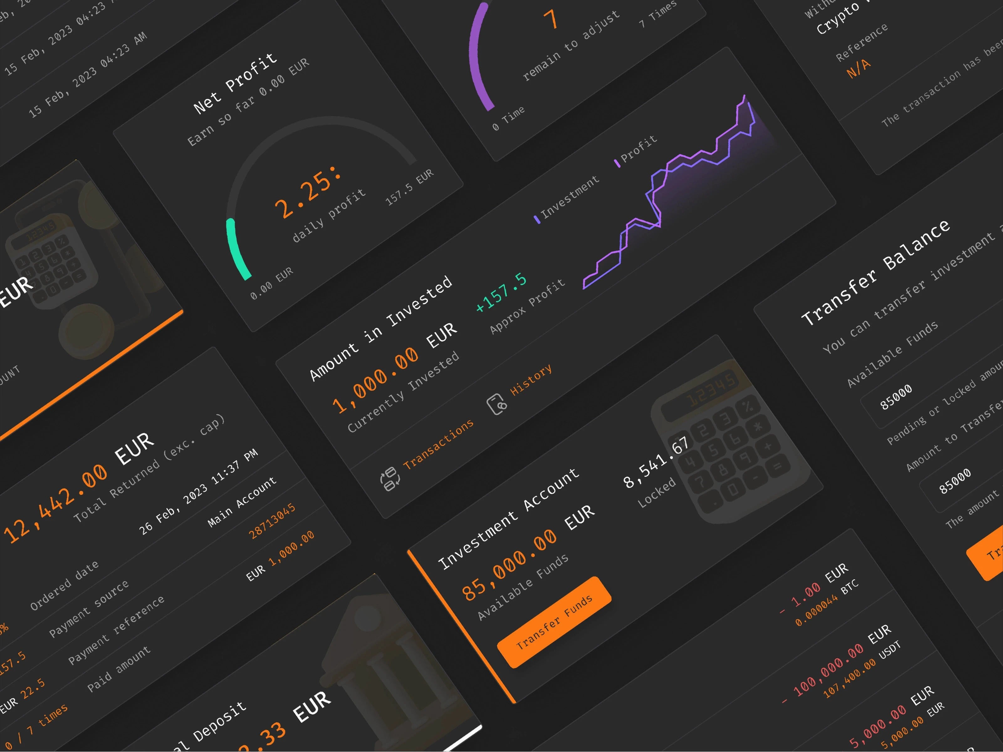 視覺風格:以深灰 / 黑色為基底,通過橙色、綠色等亮色突出核心數據(如收益、資產余額)與交互按鈕,營造出 “專業(yè)、理性” 的金融氛圍;界面元素簡潔利落,模塊化布局清晰劃分投資賬戶、收益統(tǒng)計、資產分布等功能區(qū)域。