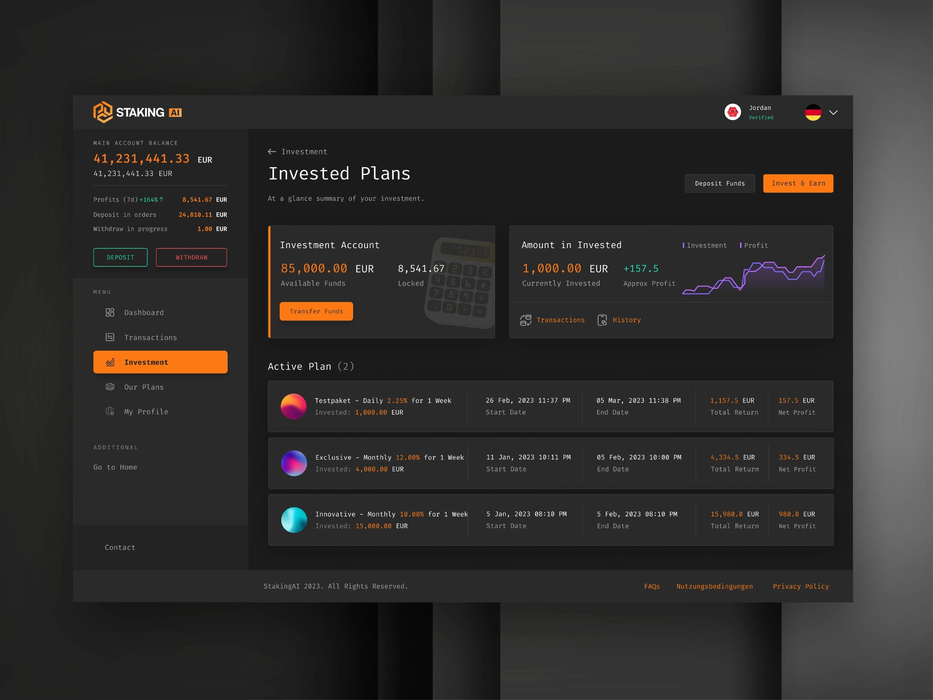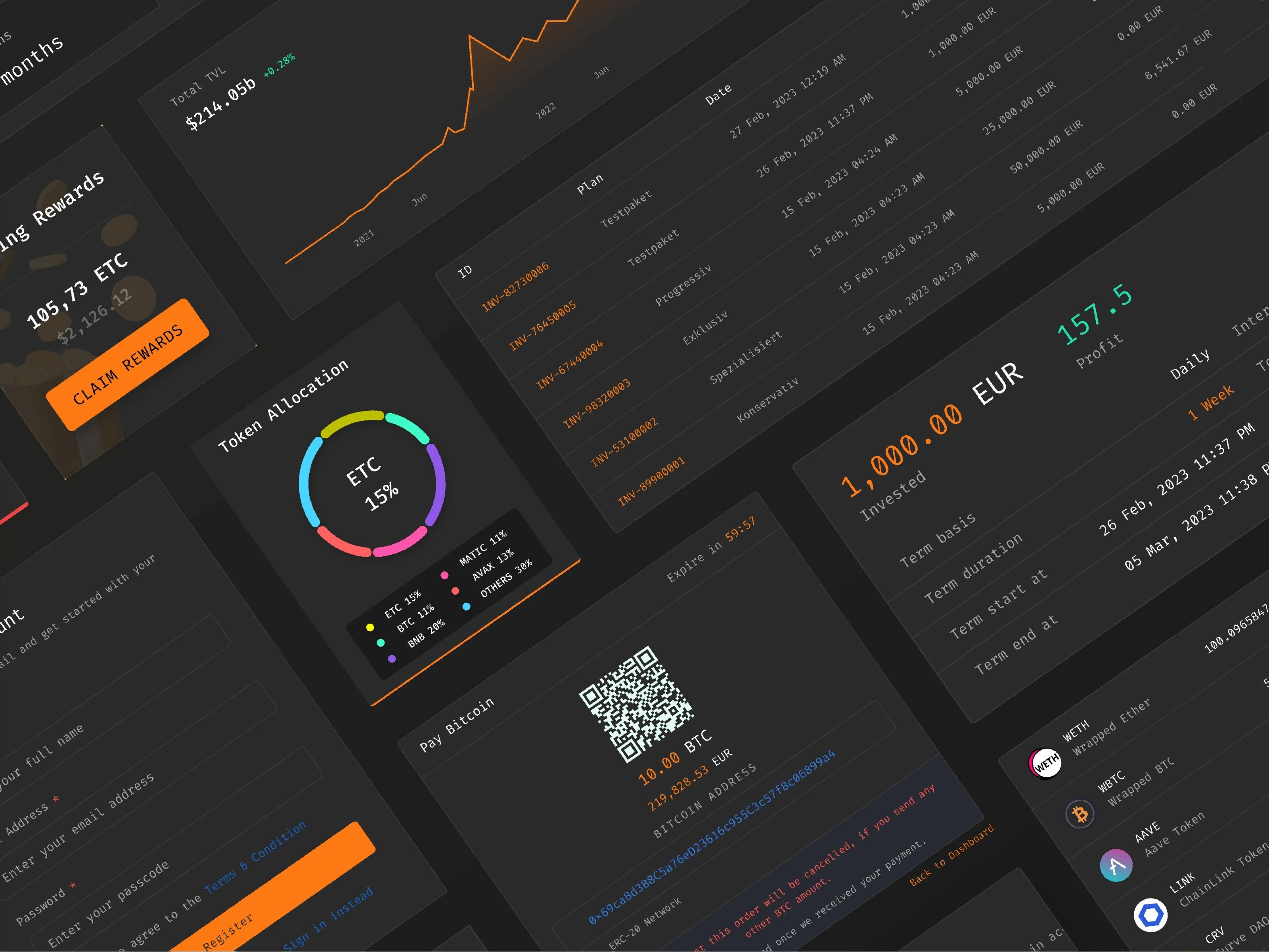 功能邏輯:聚焦 “投資全流程管理”,從資產充值、投資計劃、收益跟蹤到資產配置,全鏈路覆蓋;通過圖表(折線圖、環(huán)形圖)、數據卡片直觀呈現(xiàn)投資收益、資產波動、代幣占比等關鍵信息,助力用戶快速決策。
