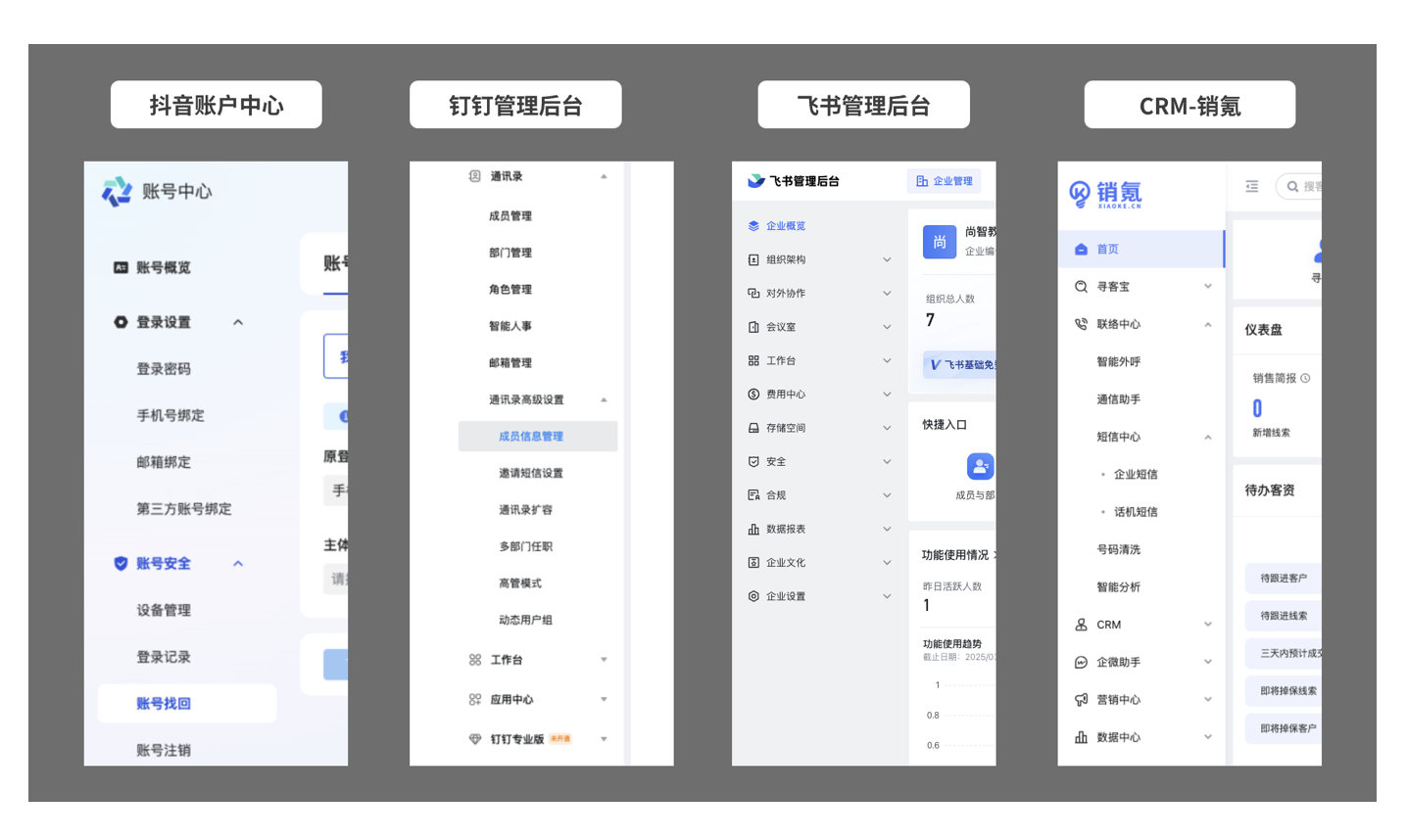 - 寬欄(混合導航):圖標與文字并存,支持多級菜單嵌套,是最常見的側邊欄樣式。通過分組標題和分割線提升信息密度,兼容性強,適合業(yè)務復雜、功能模塊較多的系統(tǒng),如抖音賬戶中心、飛書管理后臺、釘釘管理后臺等。