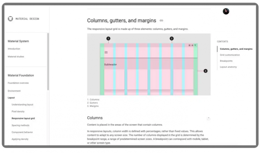 Material Design的柵格布局是響應(yīng)式的,能夠根據(jù)設(shè)備的屏幕大小和方向自動(dòng)調(diào)整。設(shè)計(jì)師可以利用五個(gè)斷點(diǎn)(xs, sm, md, lg, xl)來(lái)定義在不同屏幕尺寸下的列數(shù)和布局方式,從而實(shí)現(xiàn)靈活的設(shè)計(jì)。