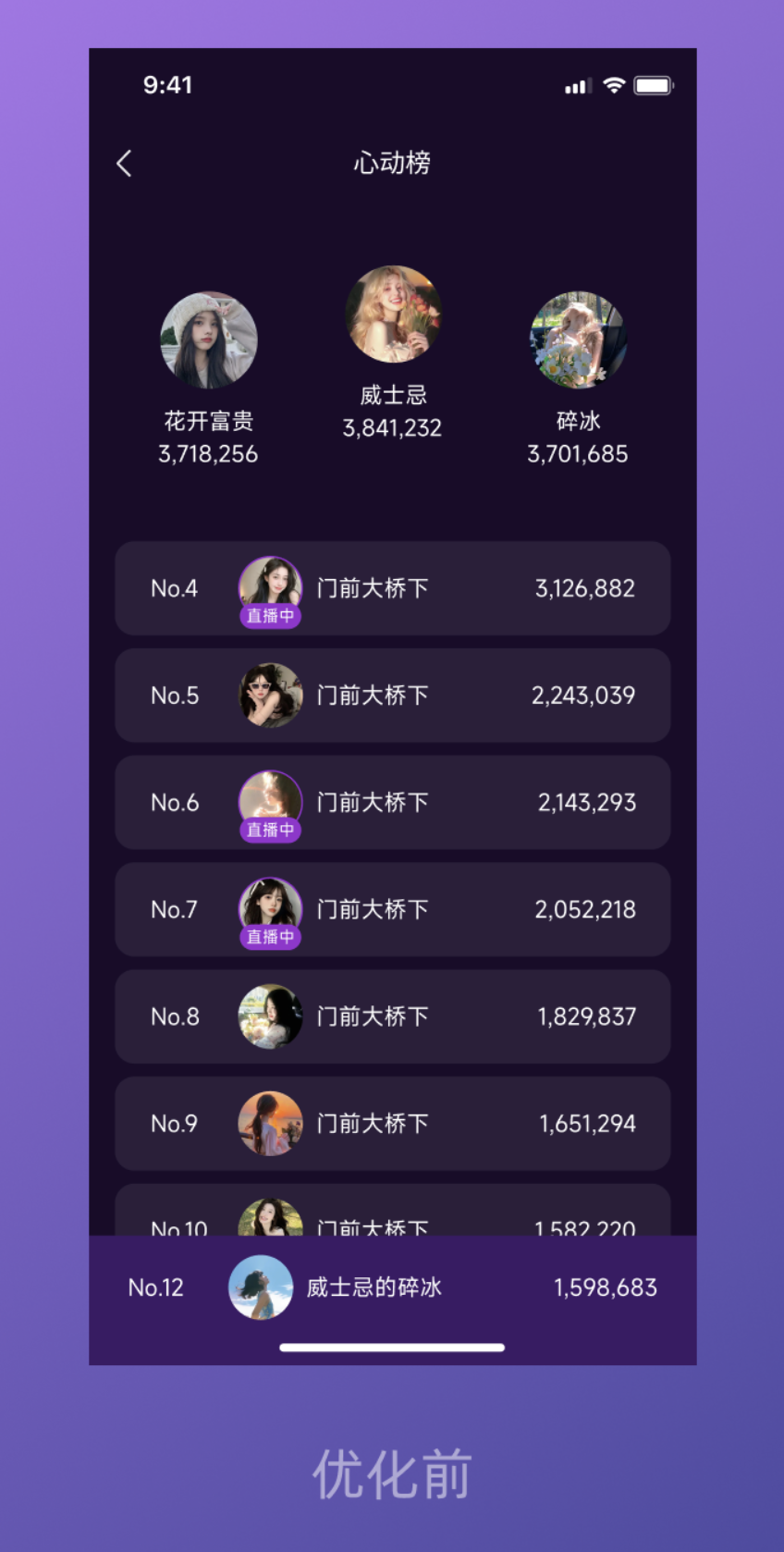 在直播平臺(tái)中,排行榜是承載用戶注意力、激發(fā)參與熱情的關(guān)鍵頁(yè)面。但很多時(shí)候,這類(lèi)頁(yè)面容易陷入 “信息堆砌” 的困境 —— 單調(diào)的列表、直白的數(shù)字,毫無(wú)設(shè)計(jì)亮點(diǎn)可言。就像這次接到的直播 “心動(dòng)榜” 優(yōu)化需求,客戶的核心訴求很明確:在不改變核心功能的前提下,讓頁(yè)面更具設(shè)計(jì)感和吸引力。