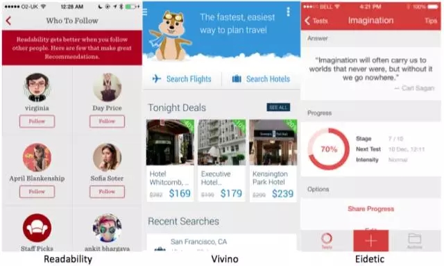 Readability采用紅色主色調(diào)設(shè)計,連提示信息背景色、線性按鈕和圖標(biāo)都采用紅色主色調(diào),界面和LOGO也完全是一個色系的。而Vivino采用藍色主色調(diào)設(shè)計,信息用深藍、淺藍加以區(qū)隔。Eidetic采用橙色主色調(diào)設(shè)計,其中的關(guān)鍵操作按鈕甚至整個用橙色提亮,信息圖標(biāo)也用深橙色、淺橙色來表達程度。 可以說唯一主色調(diào)設(shè)計手法,是真的做到了移動端APP的最小化(Minimal)設(shè)計,減少冗余信息的干擾,使用戶專注于主要信息的獲取。