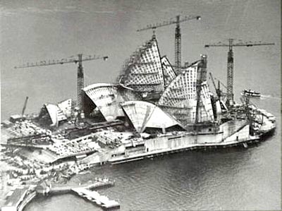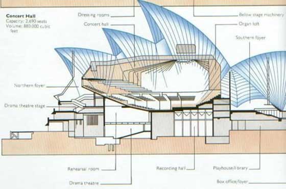 , 在最后找到一個經(jīng)濟上可以接受的解決辦法之前,設(shè)計隊伍反復(fù)嘗試了12種不同的建造“殼”的方法(包括拋物線結(jié)構(gòu),圓形肋骨和橢圓體)。后來團隊中的某個 人建議將所有球形房頂,在同一個巨大的同心圓上切割出來。該辦法可以使用一個共同的模具澆注出不同長度的圓拱,然后將若干有著相似長度的圓拱段放在一起形 成一個球形的剖面。究竟誰是這個解決辦法的發(fā)明者至今都是爭論的話題。 深化設(shè)計后的歌劇院變成了一個暖壺,內(nèi)外被分成了壺膽和壺罩的關(guān)系,這是建筑史上思想的一次突破,從此有一種建筑它的立面和內(nèi)部空間可以毫無關(guān)系了,所謂表現(xiàn)主義建筑就在這個蛋殼下誕生了。 當(dāng)然制作這個“殼”是要付出代價的,悉尼歌劇院的“殼”由著名的建筑商Hornibrook Group Pty Ltd負(fù)責(zé)建造,Hornibrook在工廠中制成了2400件預(yù)制肋骨和4000件屋頂面板,加快了工程的進度。這個解決辦法的成就在于利用預(yù)制混凝土 構(gòu)建從而避免了建造昂貴的模具(他同樣允許讓屋頂面板在地上就大片的預(yù)先建造組合好,而不是在高處一個一個的拼接上)。Ove Arup和合作方的工地工程師驚訝于這些“殼”在完工前使用了創(chuàng)新的調(diào)節(jié)型彎曲鋼鐵桁構(gòu)梁來支撐不同的屋頂。 第三個大麻煩幾乎使工程被擱置了,悉尼歌劇院的屋頂是由2194塊每塊重15.3噸的彎曲形混凝土預(yù)制件,怎樣的力學(xué)結(jié)構(gòu)才能讓這些水泥砣安全地架在上 面,這是所有結(jié)構(gòu)工程師不曾遇到的挑戰(zhàn),大家都沒了信心,這是掉腦袋的活呀。主意還是來自門外漢,烏特松看見孩子玩的提線木偶,放在桌子上的時候是一灘爛 泥,把線體起來就精神抖擻了。最后工程師們用鋼纜把所有的預(yù)制構(gòu)建拉緊拼成的一體,屋頂?shù)闹亓Ρ幻恳粋€角度的部件分散了,這是建筑業(yè)上的一個偉大創(chuàng)舉。 第四個大麻煩幾乎是無法逾越的,也是工程師們永遠(yuǎn)解決不了的,那就是預(yù)算不準(zhǔn)確帶來的巨額超支。這個建筑本來的預(yù)算是700萬元,但最終的造價高達1億2 千萬元以上,為此州政府幾乎一度破產(chǎn),歌劇院成為全體澳大利亞人的一塊心病。為了籌措建造悉尼歌劇院的資金,卡希爾開始發(fā)行悉尼歌劇院的彩票。漸漸地設(shè)計 師烏特松成了悉尼的千古罪人,所有人都開始詛咒這個半路出家的二把刀。他與州政府的關(guān)系也慢慢開始惡化,最終雙方選擇決裂,1966年烏特松辭職而去,并 且發(fā)下誓言從此在不登上澳大利亞的國土。 我們的總設(shè)計師甩手走人后,原設(shè)計師團隊中的澳大利亞設(shè)計師們肩負(fù)起了歌劇院繼續(xù)修建工作,愛國主義和責(zé)任心支持者這些人在痛苦中掙扎,麻煩一個接著一個 出現(xiàn),但是解決麻煩的創(chuàng)意又一個一個誕生了,工程時干時停。整個州政府算是被綁架了,總不能扔個爛尾樓在悉尼市最美麗的港灣上吧?繼任的設(shè)計師們總體上堅 持了烏特松的設(shè)計理念,只有在最后的裝修階段,選擇了更為粗狂的風(fēng)格,看上去像是一個大毛坯房,而不是烏特松這位瑞典家居設(shè)計師腦海里原本想像的奢華浪 漫,一方面是因為七十年代的時候水泥建筑非常流行,另一方面可能也是很大的原意就是建造悉尼大劇院的整個過程中一直都是缺錢的狀態(tài)。 除了建筑結(jié)構(gòu)部分的精彩,這部建筑作品還在有著建筑業(yè)內(nèi)另外的成就,首先是屋頂?shù)拇纱u,在建筑的設(shè)計初期,很多人就提出了該建筑清洗方面的質(zhì)疑,烏特松開 始設(shè)想一種不用清洗的方式解決它,一家丹麥的瓷磚公司為此投入了研究。最后悉尼歌劇院的屋頂覆蓋著105萬塊白色或奶油色的瓷磚,瓷磚是亞光與拋光的相間 排列,在太陽光的照射下閃閃發(fā)光。瓷磚經(jīng)過了特殊處理,因此不怕海風(fēng)的侵襲,也不需要清洗。對于一個1958年的建筑來說, 另外一點,整個悉尼歌劇院采用的是集成式設(shè)計體系,所有的地板都是水泥預(yù)制件,用四條螺絲固定在地面上,隨時可以拆卸掉起,這為維修地面下面的管線提供了 最好的解決方案,這在上個世紀(jì)五十年代也是第一次有人嘗試的建筑方法。還有一點更加令人驚嘆,這個劇院沒有空調(diào)系統(tǒng),它的恒溫系統(tǒng)來自周圍的海水。一系列 工程學(xué)、材料學(xué)、建筑學(xué)、設(shè)計學(xué)上面的突出表現(xiàn),讓悉尼歌劇院成為了人類建筑史上的璀璨明珠。 經(jīng)過了千辛萬苦的努力與堅持,悉尼歌劇院最后在公元1973年10月20日正式開幕。開幕式邀請了英國女王親臨現(xiàn)場。悉尼歌劇院在英國女皇伊麗莎白二世
