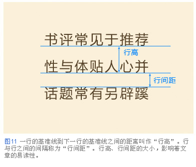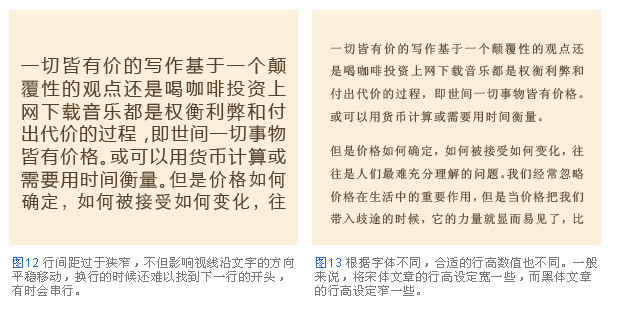 行高,行間距的大小對(duì)文章的易讀性有很大的影響。行與行之間拉得過(guò)開,從一行末尾移動(dòng)到下一行開頭,視線的移動(dòng)距離過(guò)長(zhǎng)增加了閱讀難度。相反,行與行之間貼得過(guò)緊,上下挨得過(guò)緊影響了視線的移動(dòng),讓人不知道正在閱讀哪一行(圖12)。正文最恰當(dāng)?shù)男懈撸緫?yīng)該設(shè)定為其文章中文字大小的兩倍。例如文字大小為8px的文章,就應(yīng)該把行高設(shè)定為16px(圖13)