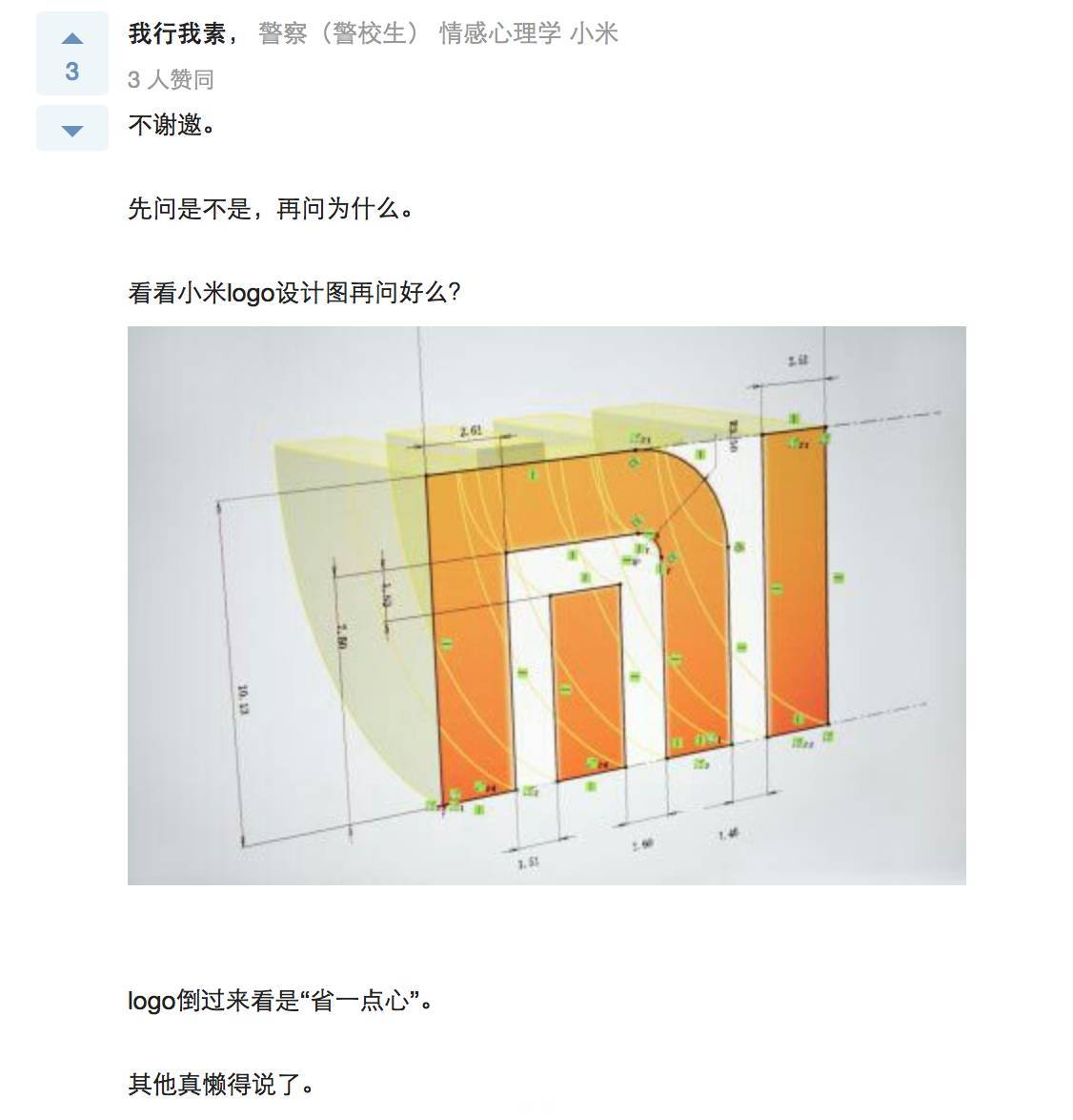 即便小米的LOGO當年剛發(fā)布的時候還是有抄襲或是撞車嫌疑,但從截圖回復(fù)來看,小米公司內(nèi)部還是對這個LOGO認可, 但我不覺得在設(shè)計之初,設(shè)計師就知道他設(shè)計的LOGO倒過來還能扯上“心”這個層面的意思。