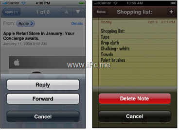 屏幕的底部一般是輔助性的工具欄或切換視圖使用的頁(yè)簽欄。一些影響較大的操作如果出現(xiàn)在屏幕下半?yún)^(qū)域,必須仔細(xì)考慮它們的排列設(shè)計(jì)。如圖5.1,一 般情況下,操作面板的取消按鈕放在最后,這樣可以鼓勵(lì)用戶閱讀完所有的選項(xiàng),暗藍(lán)色的返回按鈕可以和一般的按鈕區(qū)分開來(lái),即便用戶沒(méi)閱讀完也知道這是返回 按鈕。對(duì)于一些影響較大的操作(如刪除),將其放在面板的頂部是最好的,因?yàn)轫敳扛菀妆豢吹剑偌由霞t色的警告暗示,用戶選擇起來(lái)會(huì)更為慎重。