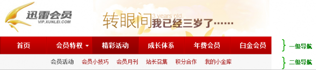 設計中使用近似的文本、顏色、圖像和留白等,可以更好的區(qū)分各個模塊。如下圖中迅雷會員導航,通過相似原則我們很容易的將一級導航和二級導航區(qū)分開來。