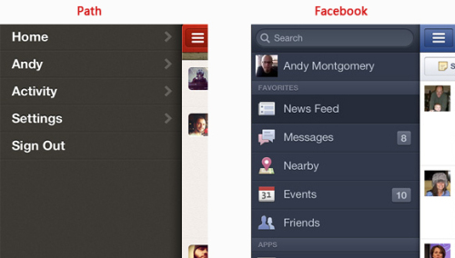 Path和Facebook的app界面,即使右側只顯示一小部分內容,而用戶卻能感知到后面更多的內容,并能將導航和內容輕易的聯(lián)系起來。