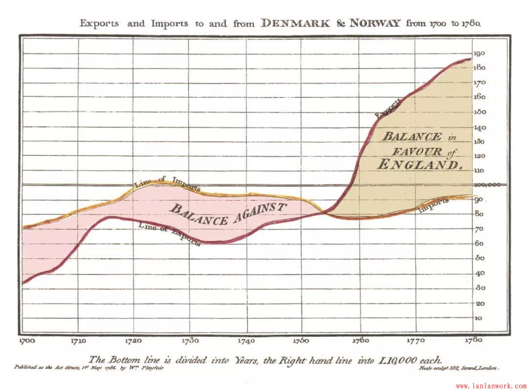 更為現(xiàn)代的信息圖表歷史可能始于William Playfair,他是統(tǒng)計(jì)圖形學(xué)的早期創(chuàng)新者。1786年,他出版了商業(yè)和政治地圖集,其中顯示了許多代表英格蘭經(jīng)濟(jì)的條形圖,折線(xiàn)圖和直方圖。他在1801年用第一張面積圖和第一張餅圖進(jìn)行了跟蹤。