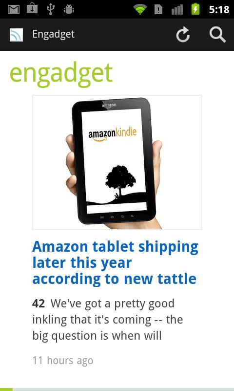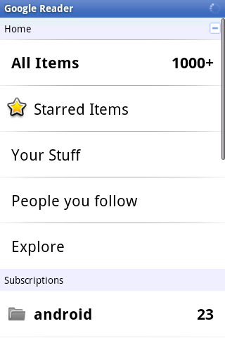 (Google Reader應(yīng)用在設(shè)備頂端顯示一個小的旋轉(zhuǎn)符號,每當(dāng)應(yīng)用在后臺加載內(nèi)容時這個符號就會出現(xiàn),這樣你就會意識到自己或許需要等待一段時間。)