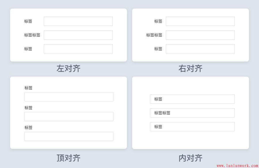 標(biāo)簽對齊方式有左對齊、右對齊、頂對齊、內(nèi)對齊,都有各自優(yōu)缺點(diǎn),不同場景酌情使用。
