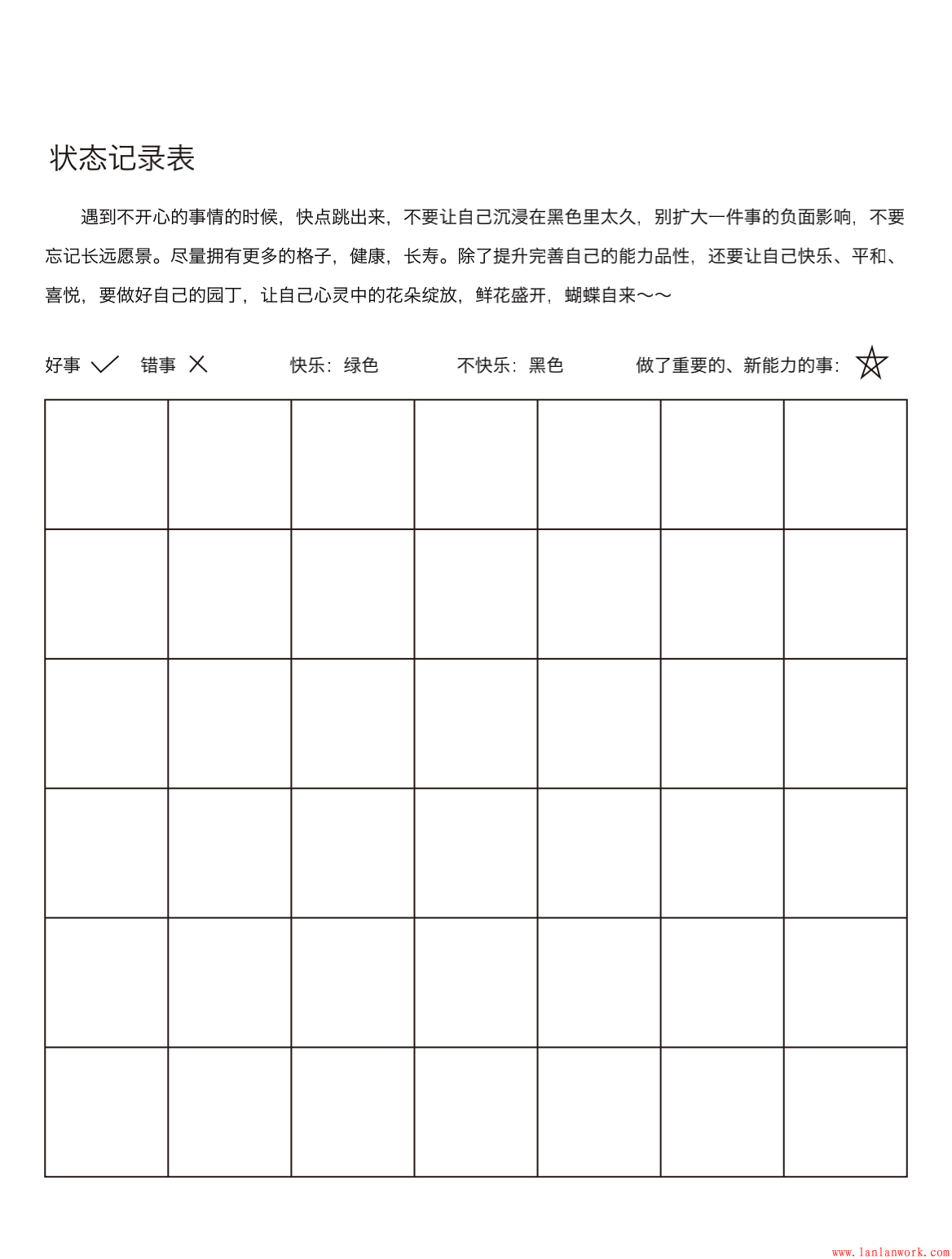 還有一種填色法,以快樂和不快樂來分,可以把自己人生想象成三萬天三萬個小格子,當(dāng)你平靜喜悅的時候,你的格子里的顏色是綠色,當(dāng)你悲傷,憤怒,崩潰的時候,你的格子里的顏色就是黑色。遇到不開心的事情的時候,快點(diǎn)跳出來,不要讓自己沉浸在黑色里太久,別擴(kuò)大一件事的負(fù)面影響,不要忘記你的長遠(yuǎn)愿景。
