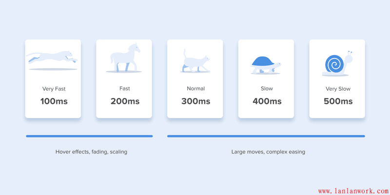大量的研究發(fā)現(xiàn)在界面中最優(yōu)的時間是200-500ms。這個數(shù)字是根據(jù)人類大腦的認知水平得出來的。任何小于100ms的動畫是人類很難感知到的,而其他大于1秒的動畫又會讓用戶覺得有些延遲,不夠流暢。