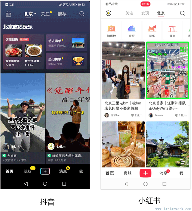 感覺(jué)小紅書(shū)比什么抖音吸引我(在沒(méi)有搜索之前推薦的東西就很吸引我),小紅書(shū)里可以學(xué)到很多東西,廚藝、書(shū)法、服裝搭配、園藝、家居、展訊,推薦的東西基本上是我感興趣的。其實(shí)這兩個(gè)APP的內(nèi)容本身都是很全的,小紅書(shū)在發(fā)現(xiàn)和北京欄目頁(yè)面是2行2列,一頁(yè)可以展示4個(gè)視頻內(nèi)容和標(biāo)題,節(jié)省了刷屏選擇的時(shí)間,相對(duì)高效。