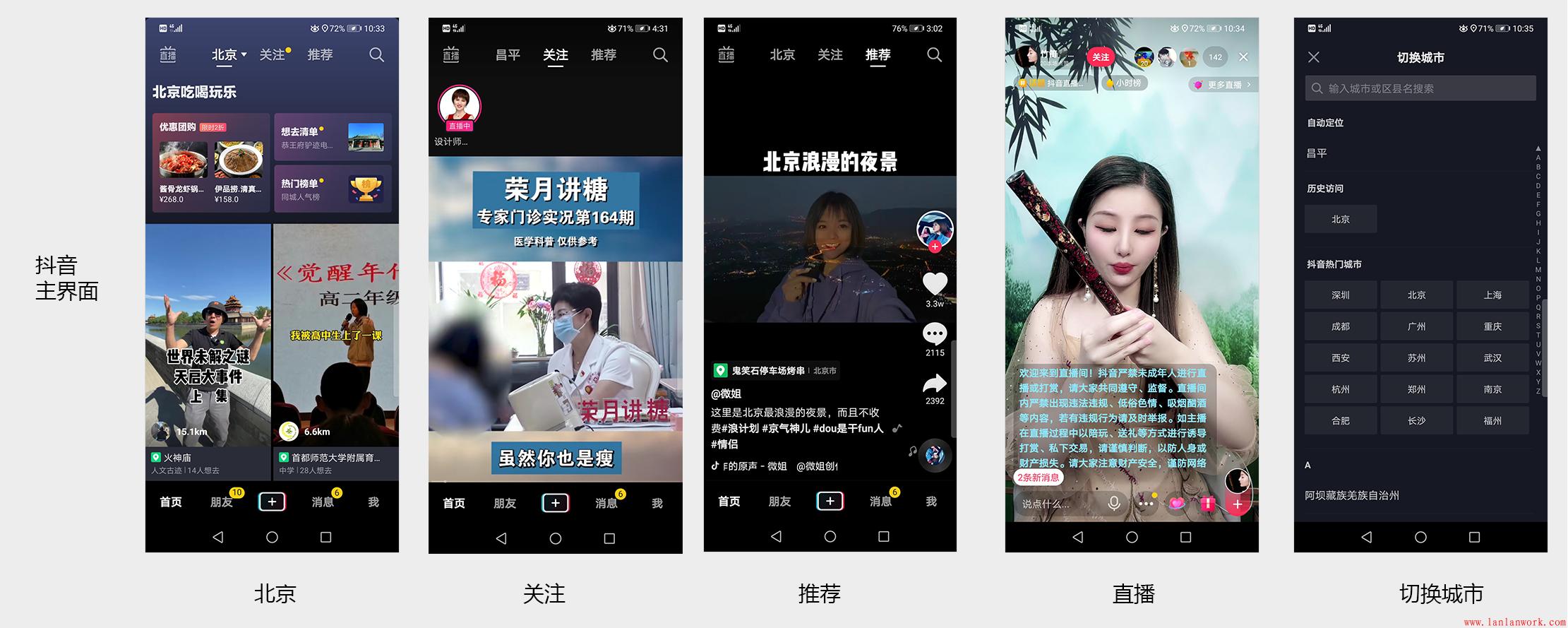 在內(nèi)容的布局上,抖音基本上各欄目就是一頁(yè)寬度放一個(gè)視頻,北京欄目下部放了2列。刷一次屏得到一個(gè)內(nèi)容,相對(duì)選擇性差。對(duì)于新用戶(hù),這可能是個(gè)盲點(diǎn)。