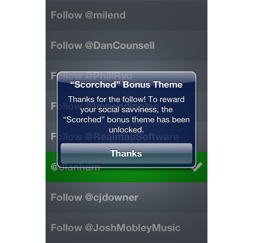 驚喜、專享 :在應(yīng)用中打開主題設(shè)置界面后,安裝了Tweetbod的用戶會收到一條消息,恭喜他們獲得了專享的額外主題。這些用戶很可能因為受到了特殊照顧而感到開心,另外,這個群體在口碑傳播方面的作用是相當大的。