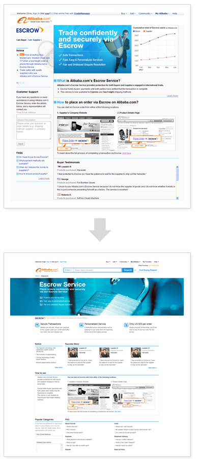 上圖我們團(tuán)隊(duì)對(duì)alibaba.com提供的服務(wù)介紹頁(yè)面進(jìn)行改版的項(xiàng)目,改版前的設(shè)計(jì)層級(jí)區(qū)分不明顯,使得用戶進(jìn)入該頁(yè)面時(shí)不能快速了解服務(wù)的概況,來(lái)判斷是否繼續(xù)深入了解;而改版后通過(guò)大小的對(duì)比,呈現(xiàn)抓住用戶第一眼印象的信息,初步判斷符合自己的需求,用戶才會(huì)繼續(xù)瀏覽。