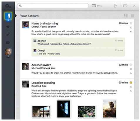 Fluent新型電子郵件界面,箭頭指向、縮進(jìn)的表現(xiàn)形式很清晰的表達(dá)信息的包含關(guān)系,雖然這個(gè)創(chuàng)業(yè)團(tuán)隊(duì)沒(méi)有成功,但產(chǎn)品的設(shè)計(jì)還是很值得借鑒的