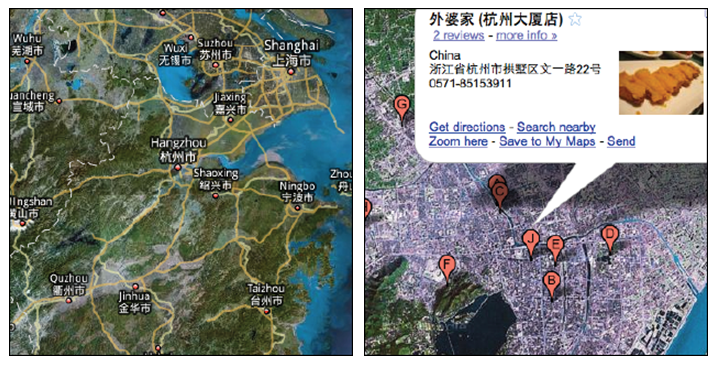 左地圖是市級(jí)展示的地名,當(dāng)用戶搜索到街道級(jí)別時(shí),才會(huì)把本街區(qū)內(nèi)的店鋪展示給用戶,在特定的情況下只展示必要的信息,有利于用戶找到自己的目標(biāo)