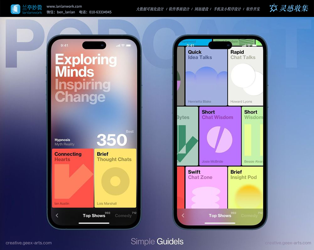 這是一款色彩鮮明的播客或內(nèi)容推薦應(yīng)用,采用大膽的撞色和模塊化布局。