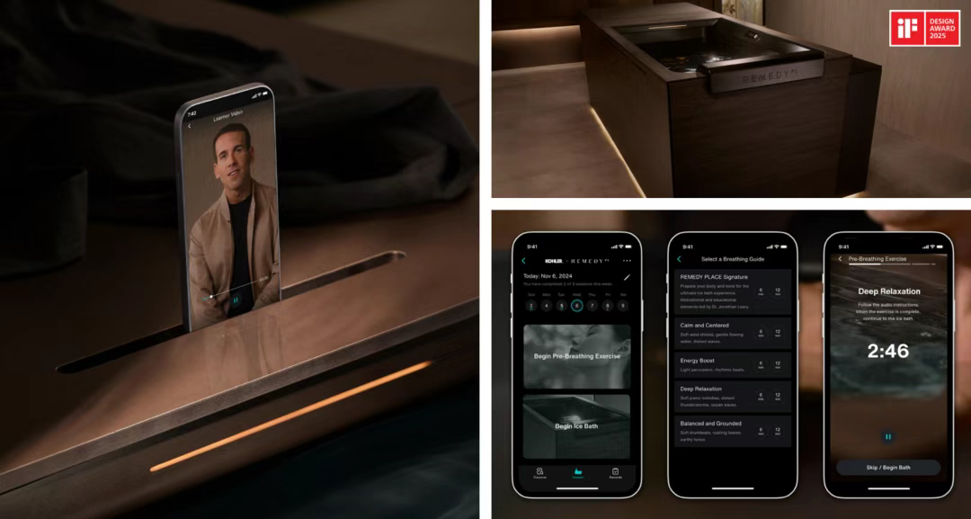 如:這款科勒 x Remedy Place 聯(lián)名冰浴桶將醒目設(shè)計(jì)、優(yōu)化人機(jī)工學(xué)和智能科技(Kohler Konnect®)融為一體,提供可定制的冷水浸泡療程,不僅兌現(xiàn)減少炎癥、提升情緒和增強(qiáng)心理韌性的健康承諾,更成為展現(xiàn)優(yōu)雅健康生活的標(biāo)志性設(shè)計(jì)。