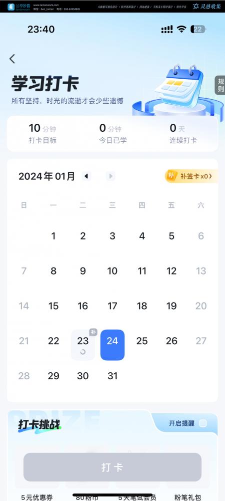 • 界面特點(diǎn):淺藍(lán)色為主色調(diào),搭配卡通日歷插畫,營造輕松的學(xué)習(xí)氛圍;底部 “打卡” 按鈕和獎(jiǎng)勵(lì)預(yù)覽,提升用戶參與感。