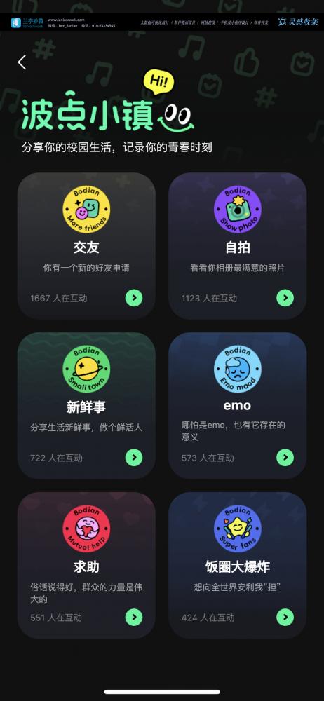 • 核心設(shè)計(jì)亮點(diǎn):用不同顏色和圖標(biāo)劃分 “交友”“自拍”“新鮮事” 等興趣板塊,每個(gè)板塊顯示實(shí)時(shí)互動(dòng)人數(shù),激發(fā)用戶參與欲。