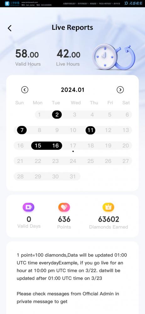 • 核心設(shè)計(jì)亮點(diǎn):頂部用大數(shù)字展示核心指標(biāo)(有效時(shí)長、直播時(shí)長),下方日歷可快速切換日期查看對應(yīng)數(shù)據(jù),操作直觀。