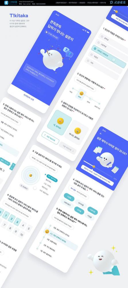 這是一款韓國風(fēng)格的問卷類應(yīng)用,以友好的藍(lán)色為主色調(diào),搭配可愛的 3D 卡通形象引導(dǎo)用戶完成問卷。