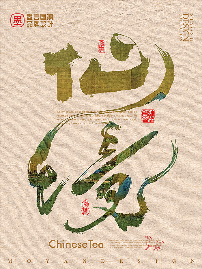 • 國(guó)潮品牌主題:圖 9 “仙” 字海報(bào),把書(shū)法筆觸與山水紋理結(jié)合,搭配 “Chinese Tea” 的英文標(biāo)識(shí),讓 “中式茶” 的文化屬性通過(guò)書(shū)法字體自然流露。