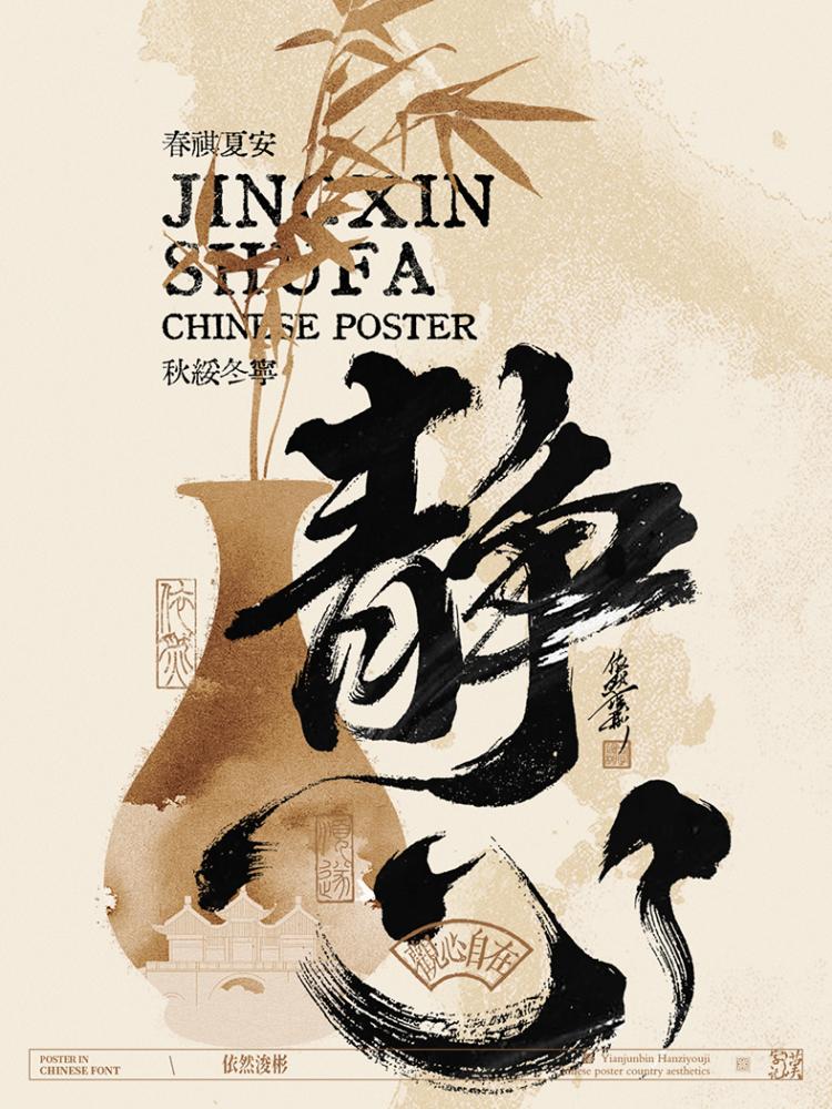 • 行楷的溫潤(rùn):圖 7 “靜” 海報(bào)中,行書(shū)的婉轉(zhuǎn)筆鋒搭配水墨暈染,把 “寧?kù)o自在” 的意境揉進(jìn)筆畫(huà)的起承轉(zhuǎn)合里,讓觀者從字形中感受到松弛。