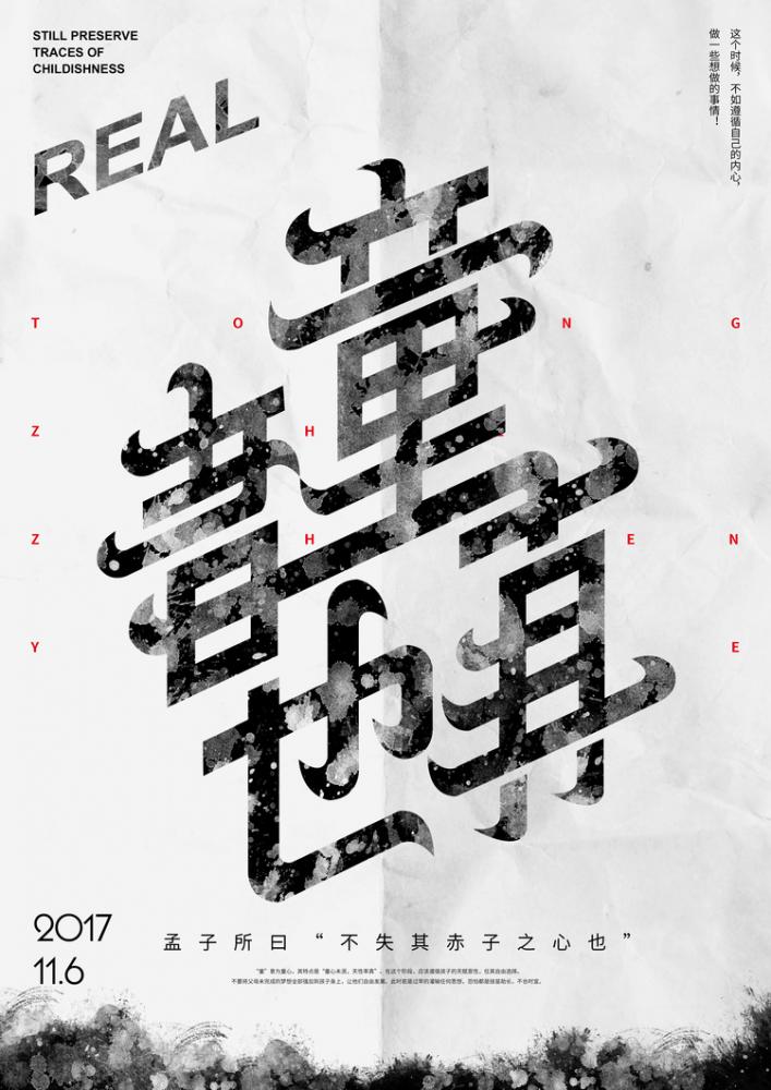 • 虛實(shí)疊加:圖 8 “童真” 海報(bào),把書(shū)法字體與英文單詞(“ZHEN”)拆分融合,水墨肌理的實(shí)與文字拆分的虛形成對(duì)比,讓 “赤子之心” 的主題更有設(shè)計(jì)張力。