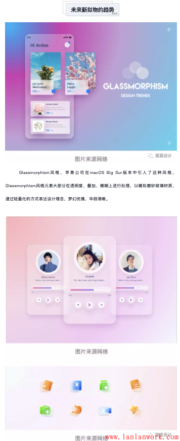 從輕擬物風(fēng)格到Glassmorphism風(fēng)格,擬物化設(shè)計的演變進(jìn)程已然開啟,未來,無論是3D設(shè)計的加入還是扁平風(fēng)格的延續(xù),“質(zhì)感”都將成為設(shè)計過程中被著重強調(diào)的風(fēng)格。