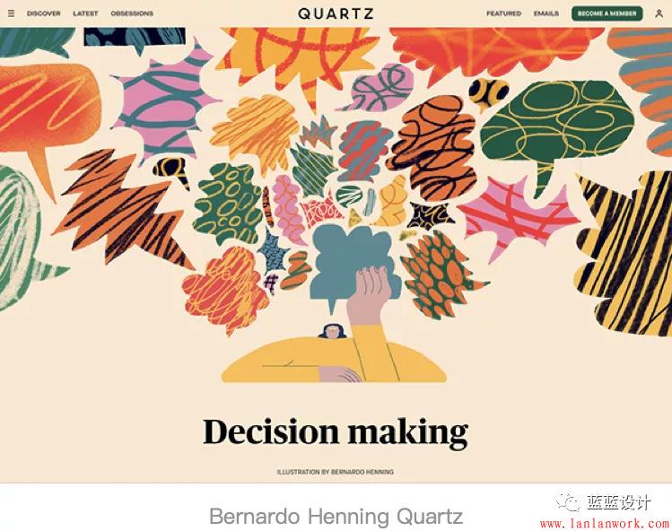 這種風(fēng)格的插畫非常像凌亂的涂鴉,乍看未完成,但所有的細(xì)節(jié)都是經(jīng)過深思熟慮的。重疊的形狀和強烈的色彩讓這些插畫與眾不同,同時能有效激發(fā)靈感。