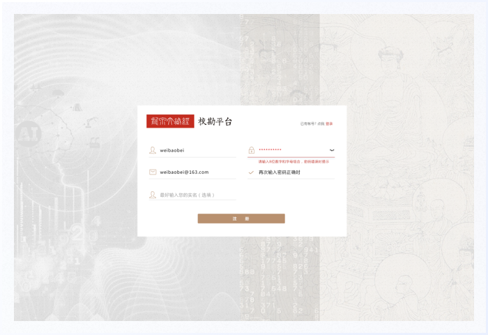 注冊頁是登錄頁的延伸頁面,可以與登錄頁互相切換。使用古典藏經(jīng)圖案作為背景,上面疊加內(nèi)容卡片且居中分布,在整體視覺上符合產(chǎn)品調(diào)性,在操作上完善各種輸入狀態(tài)的反饋。